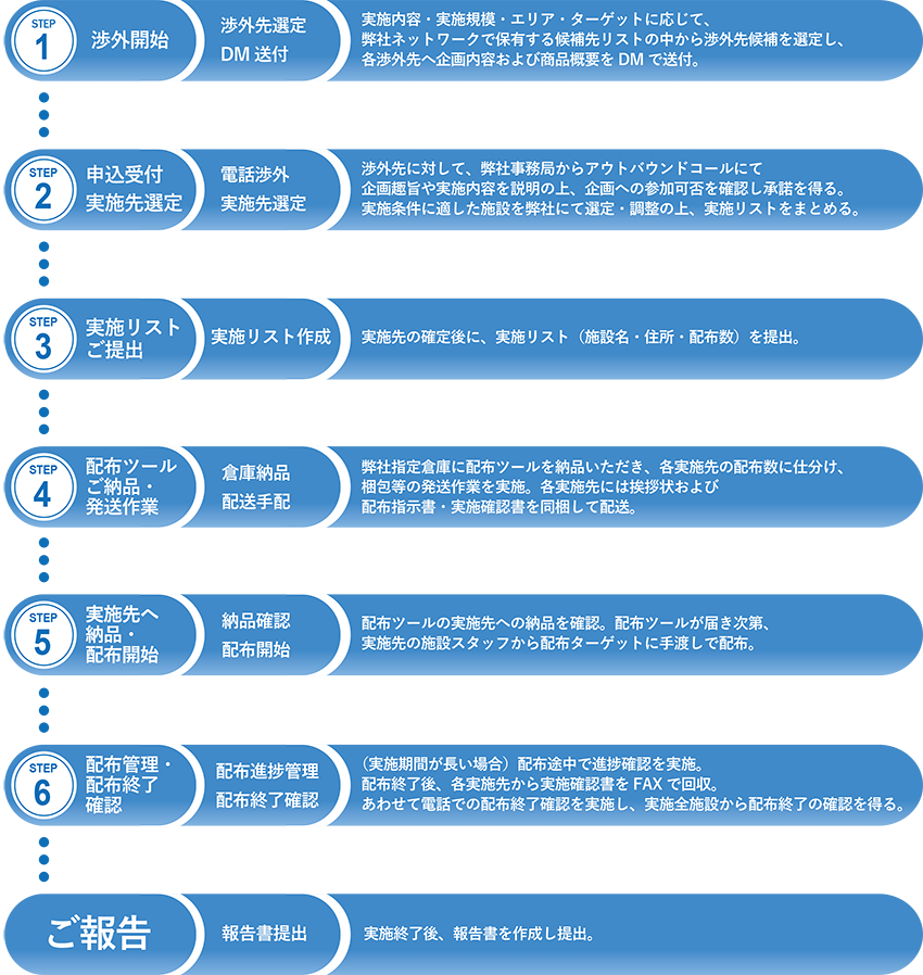 プロモーション展開先の窓口担当者とリレーションを深めることで、実施フローの各ステップにおける連絡・確認がスムーズに進行し、企画趣旨に沿ったクオリティの高い実施展開を実現します。